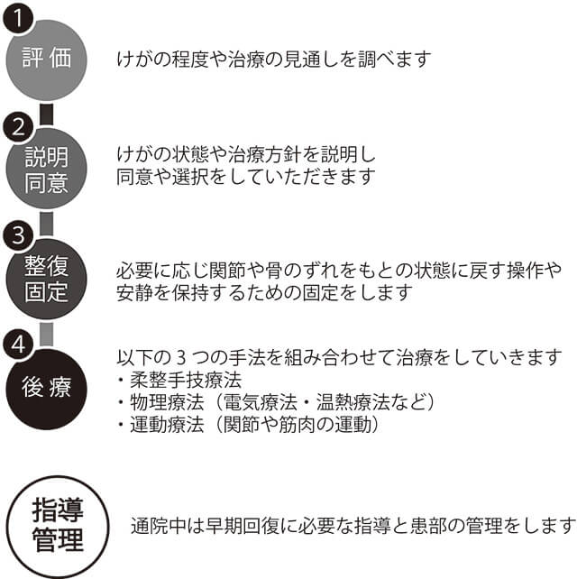 接骨院では、骨折・脱臼・捻挫・打撲・挫傷(筋肉や腱などの軟部組織の損傷・肉ばなれ等)に対して、保存的治療(注射や手術を行なわない治療)を行なう専門家が、けがの種類や程度を見分け、そのけがに合った適切な治療を行ないます。